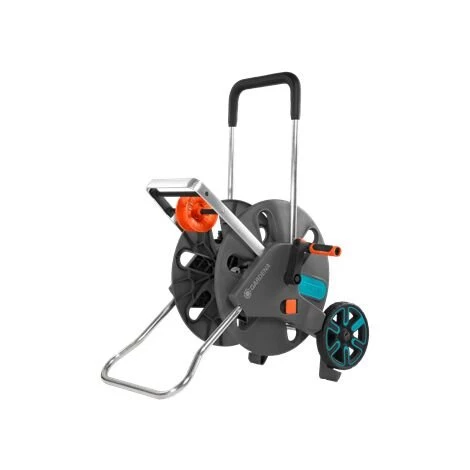 Grâce au support de base repliable, le dévidoir ne tombe pas dès qu’on tire sur le tuyau. Le design du dévidoir ainsi que les roues surélevées garantissent une grande stabilité. Il suffit de replier simplement le support de base pour le stockage du dévidoir.