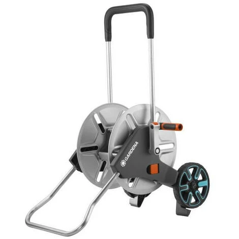 Dévidoir sur roues AquaRoll M Metal – Pour max. 60 m de tuyau Ø int. 13 mm, 50 m de tuyau Ø int. 15 mm – Tambour en une piece de métal, manivelle ergonomique repliable en métal avec composants en plastique souple – Fonction Kick&Stand pour plus de stabilité – Poignée télescopique pour guidon réglable.
