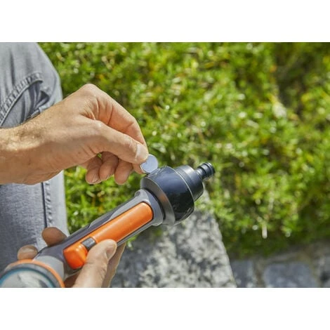 La poignée ergonomique offre un arrosage facile et confortable. La fonction de verrouillage permet que le jet d’eau se poursuive et évite donc de devoir appuyer en permanence sur la gâchette. Le débit est réglable en continu d’une seule main.