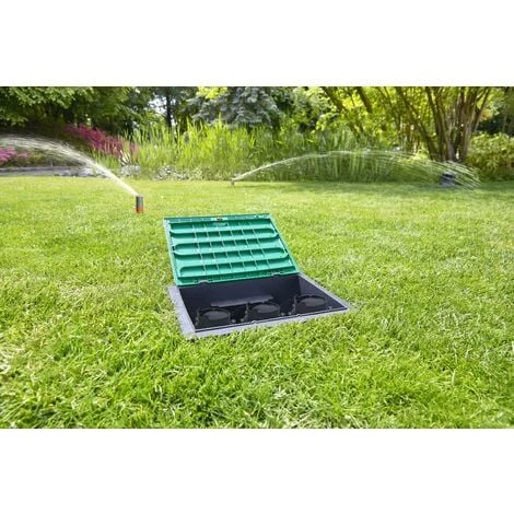 Le regard 3 voies GARDENA permet d’enterrer soit trois électrovannes 24 V (Réf. 1278-20) soit trois électrovannes 9 V (Réf. 1251-20).