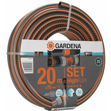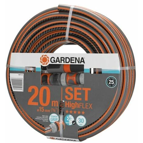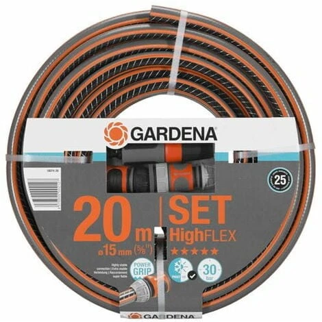 Contenu du kit : Tuyau d’arrosage Comfort HighFLEX 15 mm 20 m GARDENA + 1 x lance de nettoyage, 1 x raccord Aquastop, 1 x raccord rapide, 1 x nez de robinet, 1 x adaptateur.