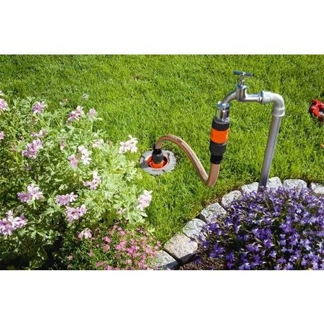 Le départ enterré GARDENA relie le robinet au système d’arrosage GARDENA enterré ou à la conduite GARDENA. Il comprend un nez de robinet à visser grand débit Profi fileté (Réf. 2713-20). Si une électrovanne ou une prise d’eau enterrée est raccordée, le raccord de tuyau se trouve sous pression continue , dans ce cas, le raccord de tuyau doit être stabilisé en pression au moyen de l’adaptateur (Réf. 1513-20). Le couvercle sphérique escamotable disparaît à l’intérieur du départ enterré lorsqu’il est ouvert, ne présentant ainsi aucun obstacle pour la tonte. Le bord large empêche que l’herbe pousse dans le couvercle. Un filtre amovible prévient la contamination de la prise lorsque le couvercle est ouvert. Le départ enterré GARDENA comporte un filetage mâle de 3/4 ».