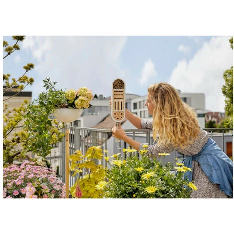 Équipez votre balcon de cethôtel à insectes facilement grâce au support pour balcon ClickUpafin d’offrir un habitat sain et sûr aux insectes. Il est idéal pour attirer et favoriser la biodiversité dans votre jardin. Ultra-design, il le décore d’un meuble moderne, épuré tout en faisant le plus grand bien pour l’environnement. L’hôtel à insectes GARDENA est fabriqué à partir de bois FSC® certifié à 100%. Il propose 4 chambres dont 2 pour les abeilles sauvages, 1 pour les papillons et 1 pour les coccinelles qui sont des insectes menacés aujourd’hui. Chaque chambre a été développée en s’appuyant sur les avis d’experts et pour le plus grand confort des insectes : elles ne dépassent pas 10 cm de long, sont en bambou, n’ont pas de pommes de pain et chaque trou est propre et lisse. La toiture et la charpente de l’hôtel à insectes GARDENA ont été laquées biologiquement pour permettre une utilisation optimale toute l’année.